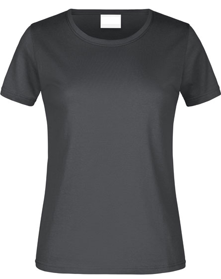 Damen T-Shirt, tailliert, 1x1 gerippter Rundhals, doppellagig. Nacken und Schulterband mit Seitennähten.
